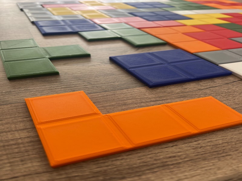 Houten lijst met 3d geprinte puzzelstukken in verschillende kleuren.